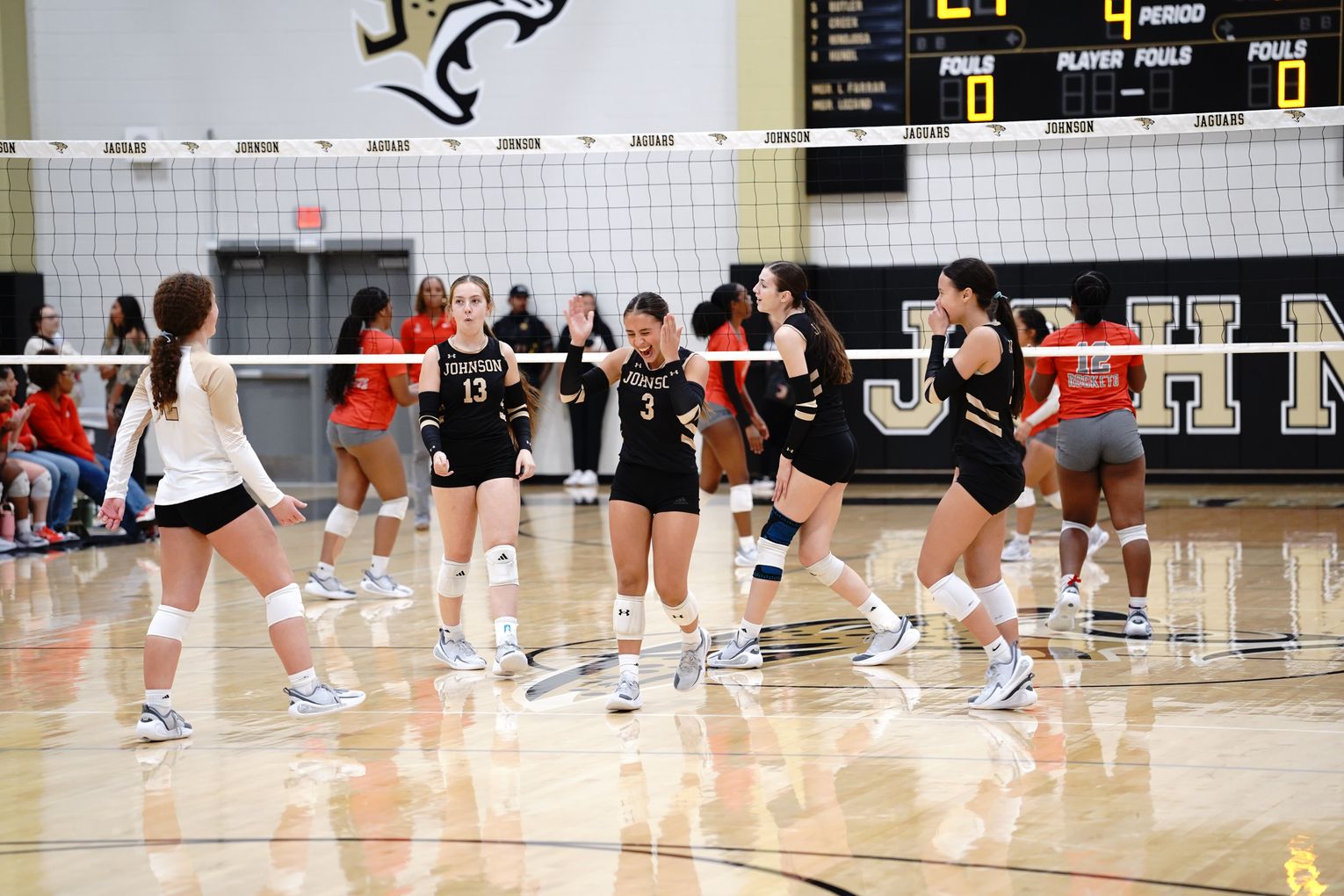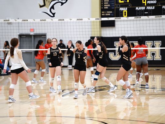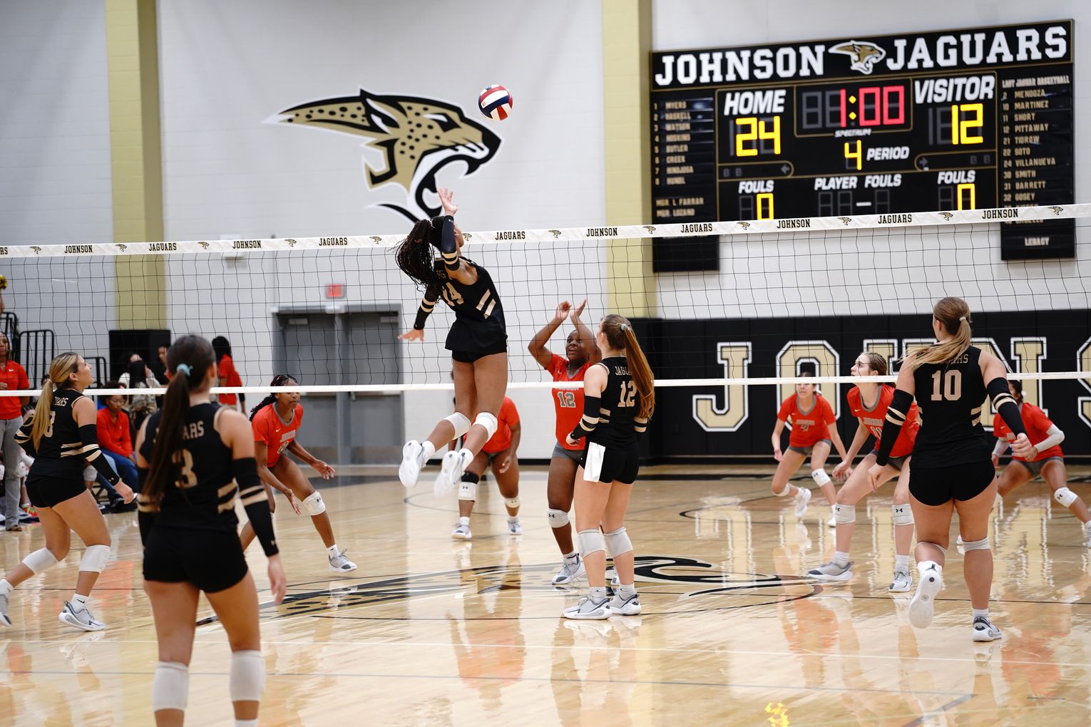Sophia Uzochukwu (No. 14) goes for a spike Friday, Sept. 26, when the Johnson High School Jaguars volleyball team hosted the Judson High School Rockets. The Jaguars won all three sets decisively — 25-10, 25-12 and 25-14. Johnson is currently in third place in the district, with a 4-1 district record and a 29-7 overall record.