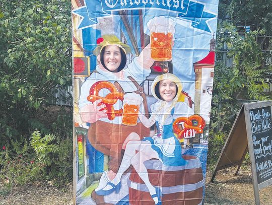 Erika Malhotra, left, and Heather Haberkorn pose for a photo in a cut-out standee at FOXTOBERFEST 2025 on Saturday, Sept. 27. The event is a “Bavarian-inspired festival,” aimed at giving people in the Hill Country a place to celebrate Oktoberfest, according to host 12 Fox Beer Co. in Dripping Springs.