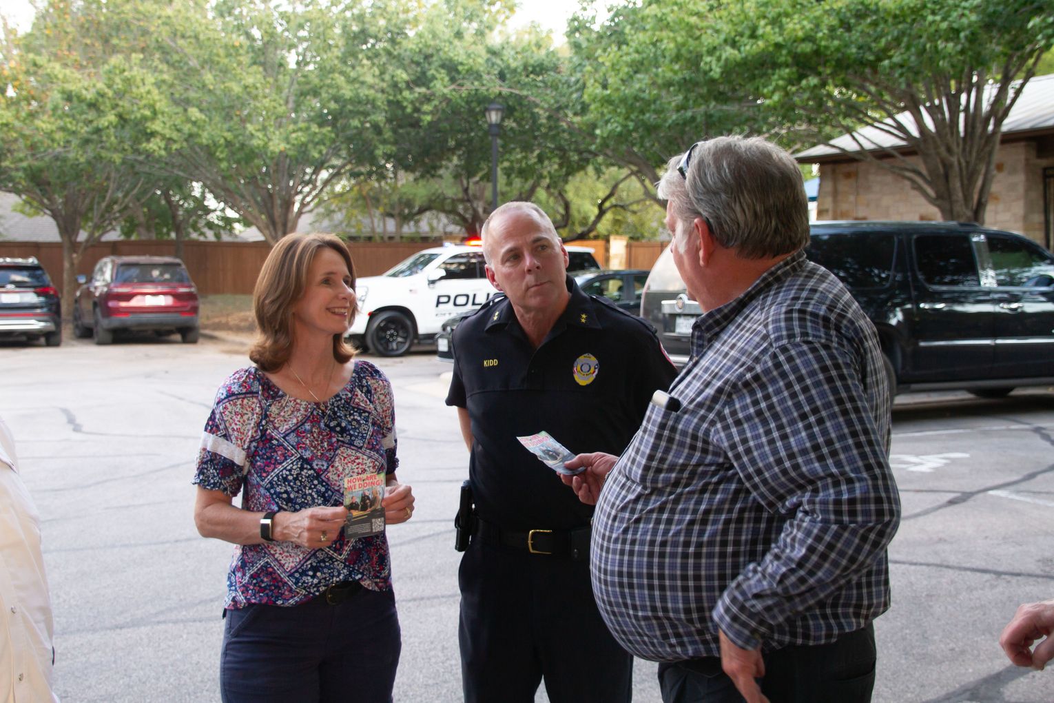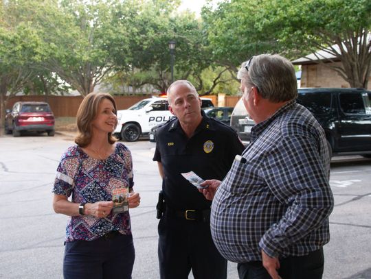 Pictured, BPD Chief Bo Kidd, center, and his wife, Cheryl, chat with a resident at the get-together in Whispering Hollow. Mayor Lee Urbanovsky and various Buda City Council members attended throughout the evening, as well.