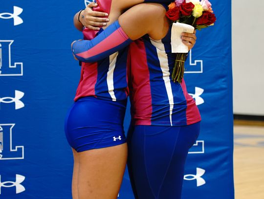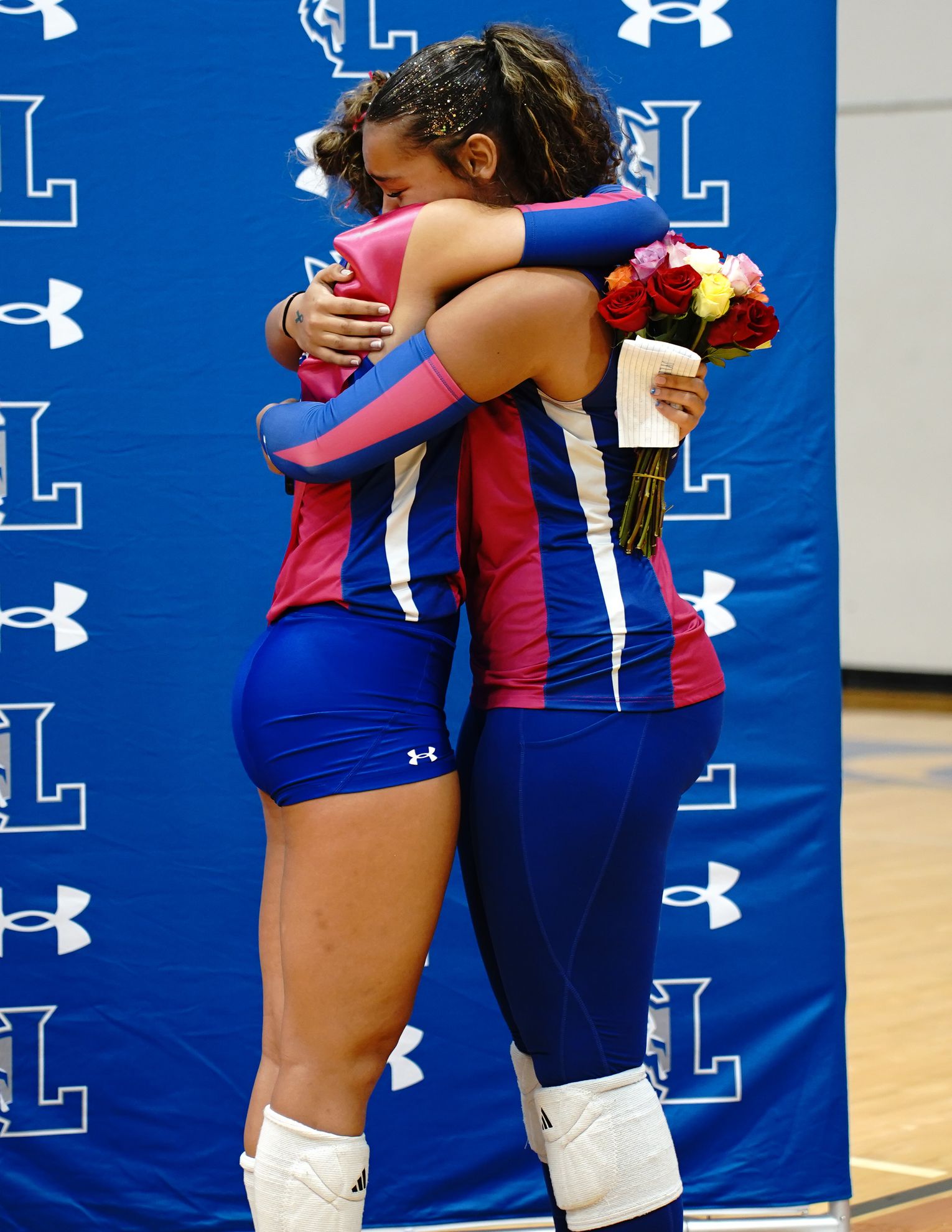 Pictured, the Long sisters, one senior and one sophomore, hug after emotional speeches during the Senior Night presentation.