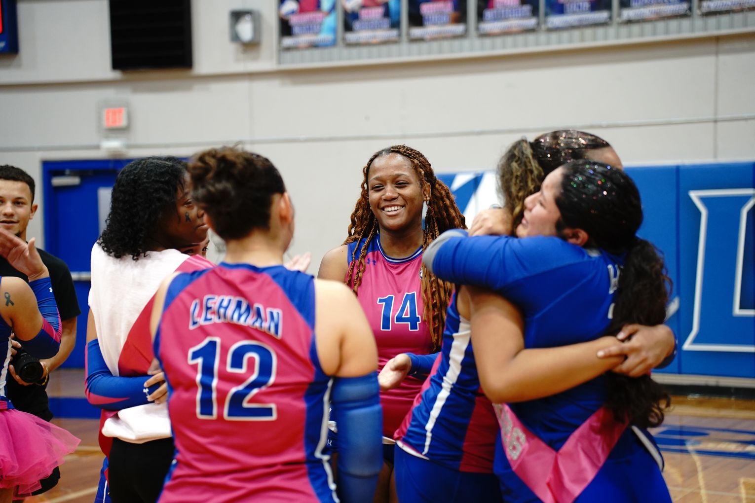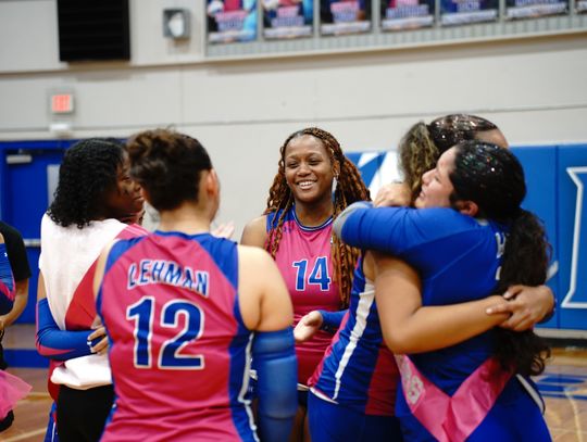 It was hugs all around as junior Tamira McQueen (No. 14) goes in for the hug with freshman Lydia Gutierrez.
