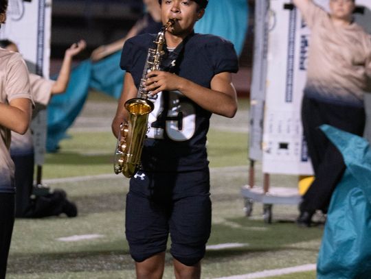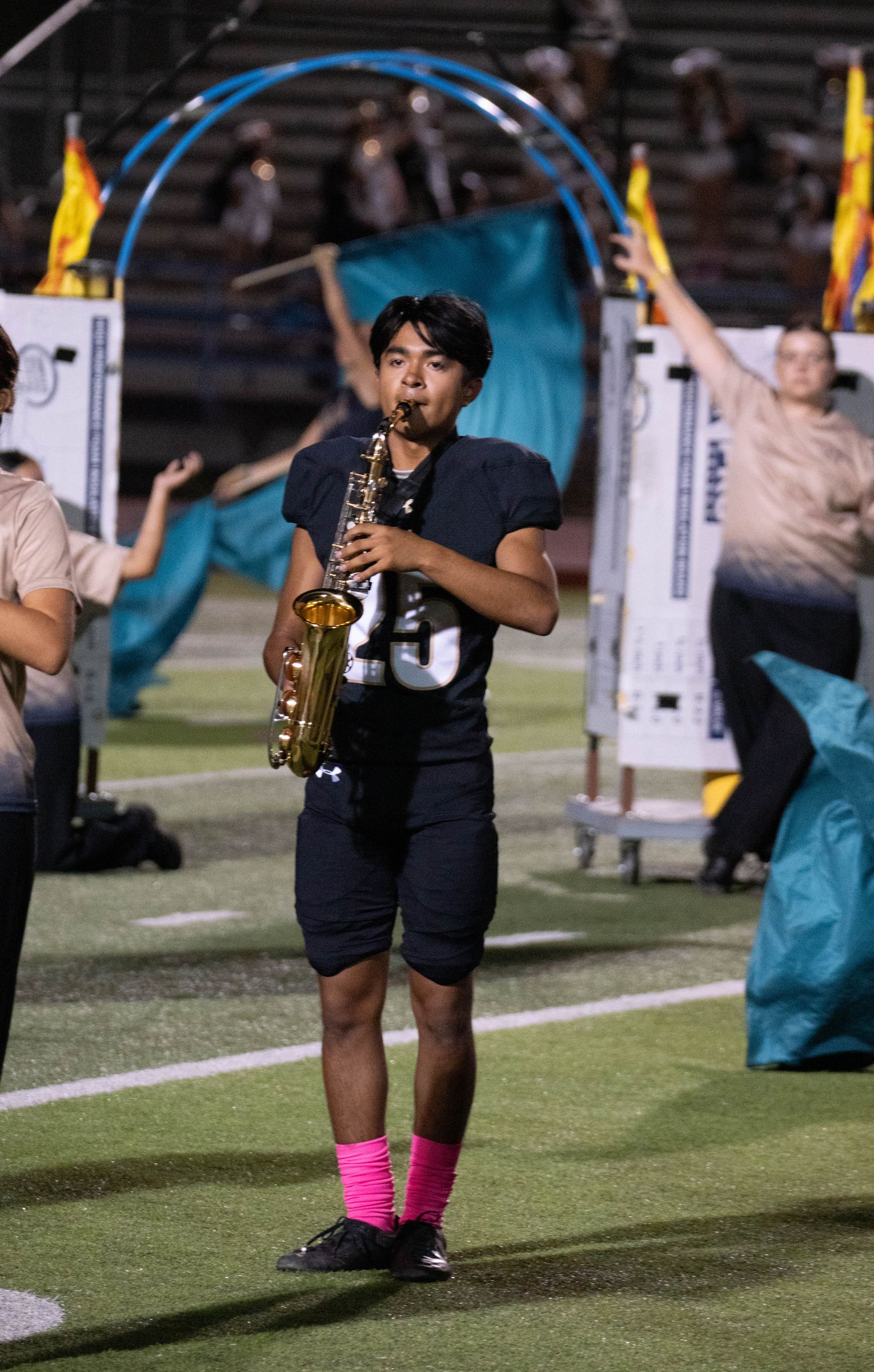 Johnson Jaguar football player and band member Christian Ramos performs the marching band’s show, titled “Alebrijes.” The band went on to earn fourth place at the 6A Area D marching competition on Saturday, which qualifies the group to perform at the state level Monday, Nov. 3.