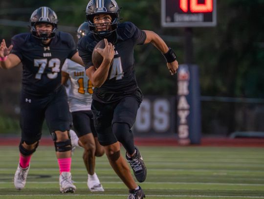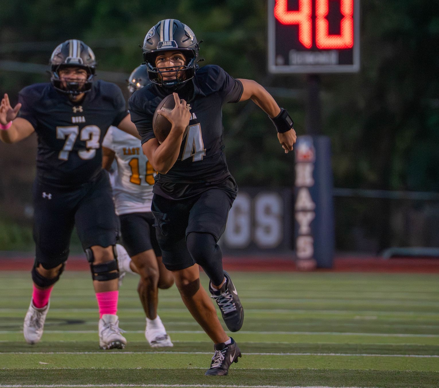 Pictured, quarterback Jonah Montgomery (No. 4) has a quarterback keeper and scores a touchdown for the Jaguars.