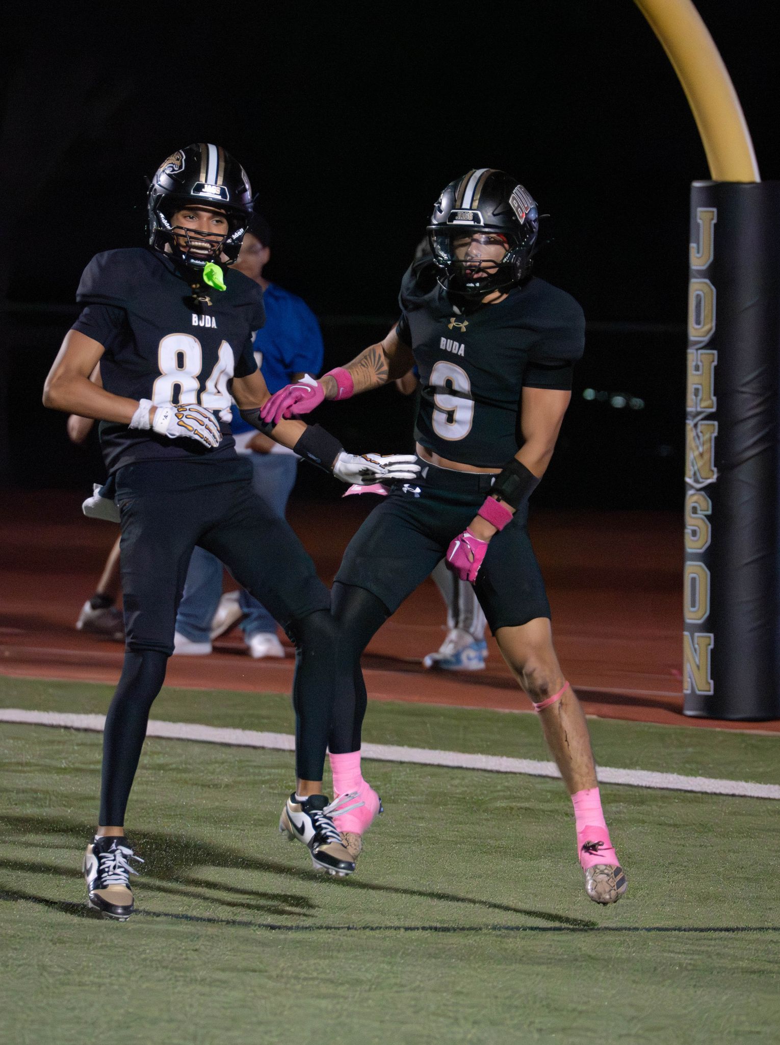 Johnson Jaguar football players Devan Brown (No. 84) and Jett Hickson (No. 9) celebrate after Hickson scored a touchdown.