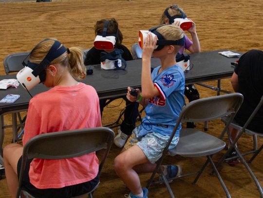 Children use virtual reality headsets, provided by the Dripping Springs Community Library, to explore a haunted house.