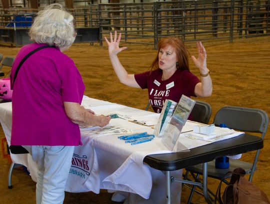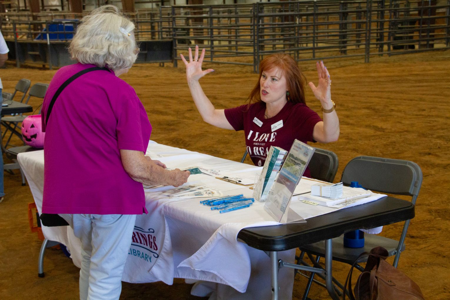 Angee Cornick, volunteer for the Dripping Springs Community Library, explains the library’s fundraising efforts to an attendee.