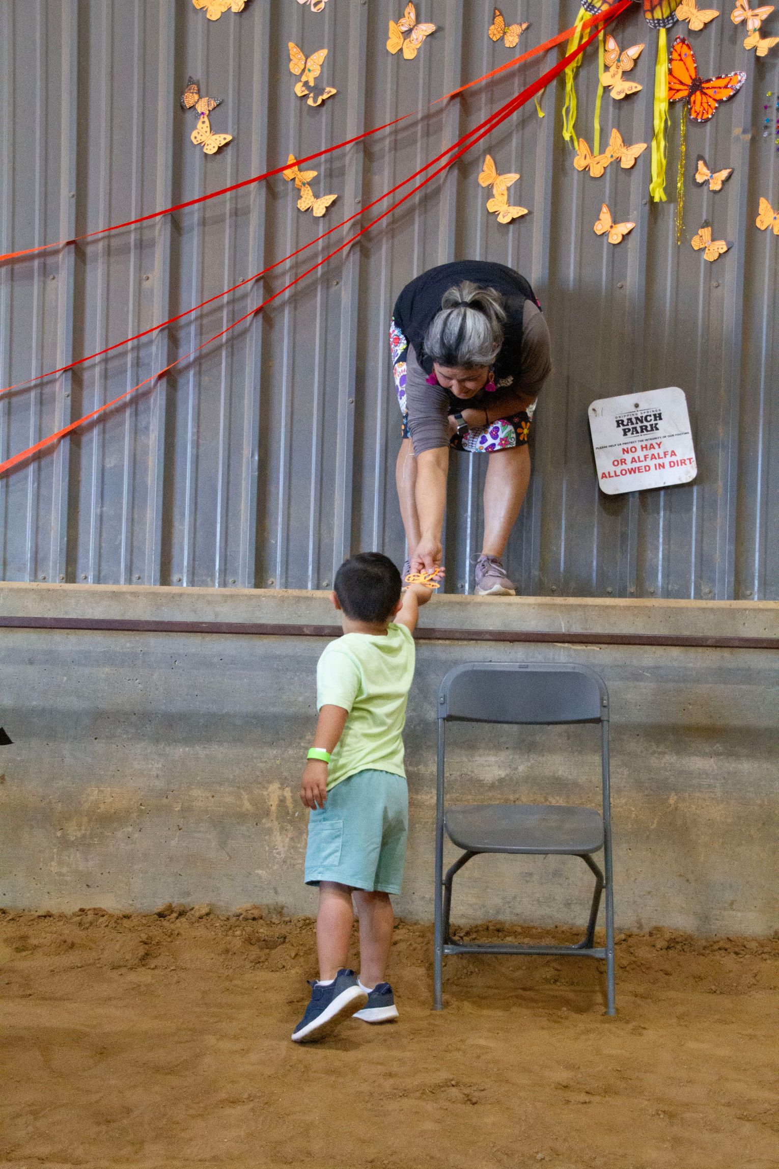 Sebastian L. hands a decorated butterfly to a DSRP volunteer to hang on a display on the wall.