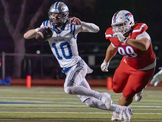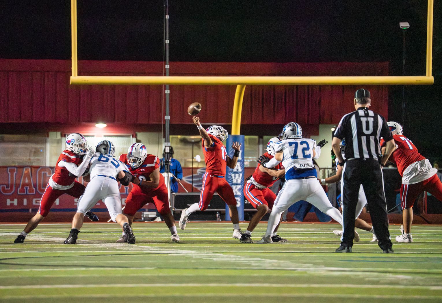 Pictured, Hays senior and quarterback Gabriel Alejandro (No. 17) releases a pass, while his teammates block the defense.