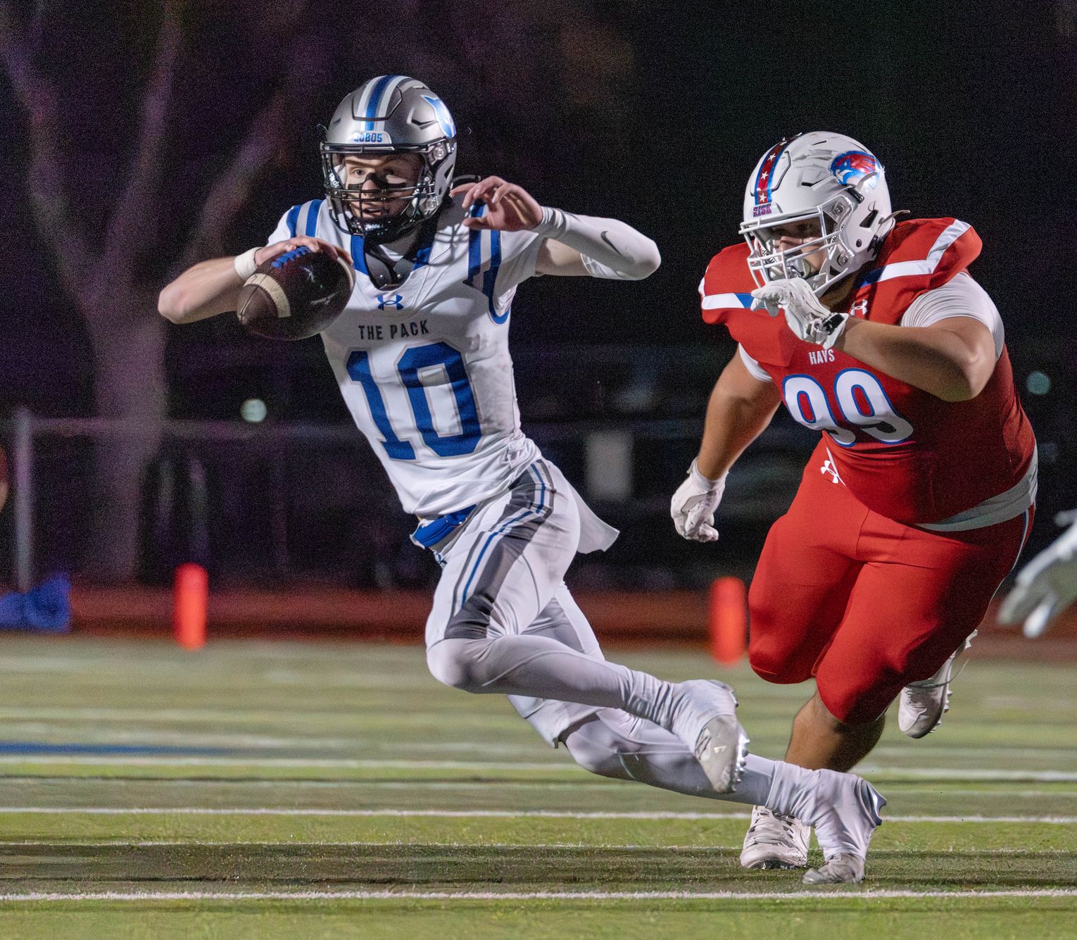 Lehman quarterback Gunner Winiecki (No.10) attempts to evade Hays’ defensive end Erik Ruesing (No. 99) in a quarterback keeper.