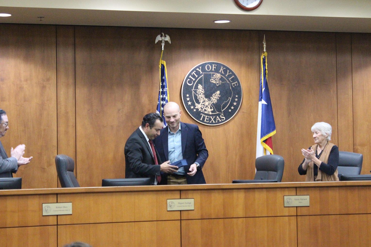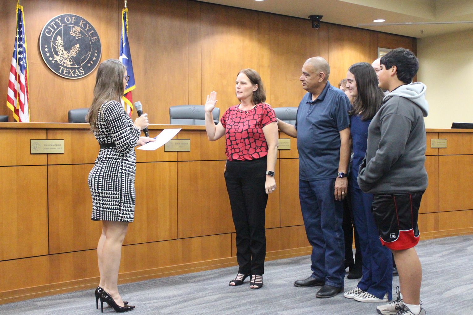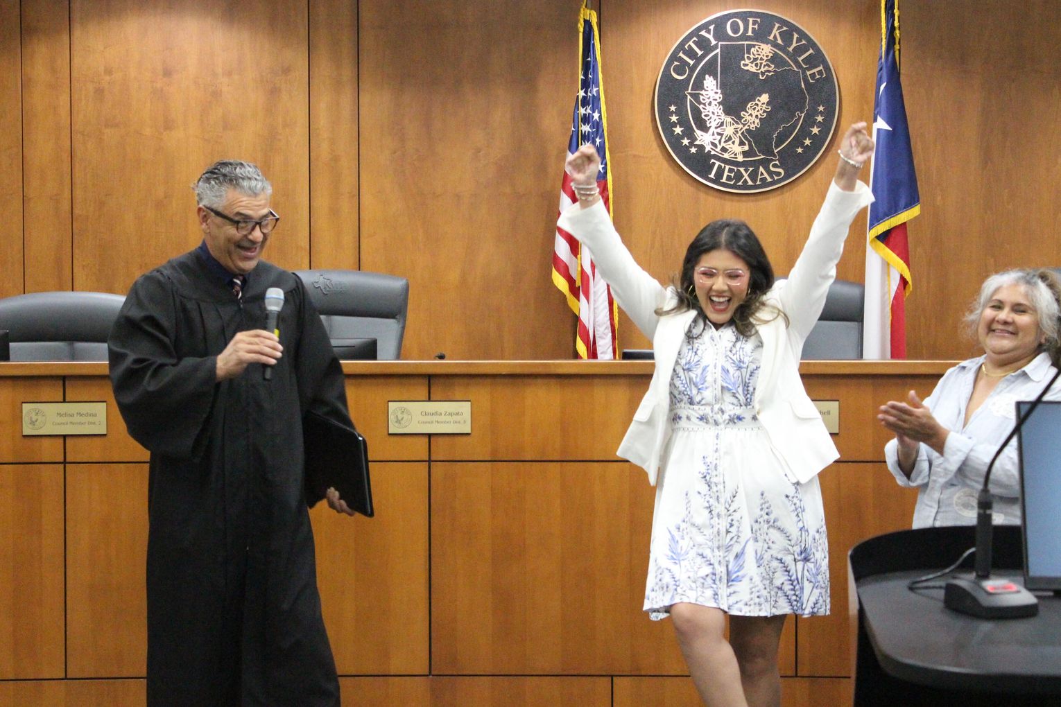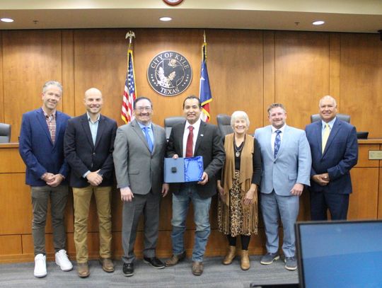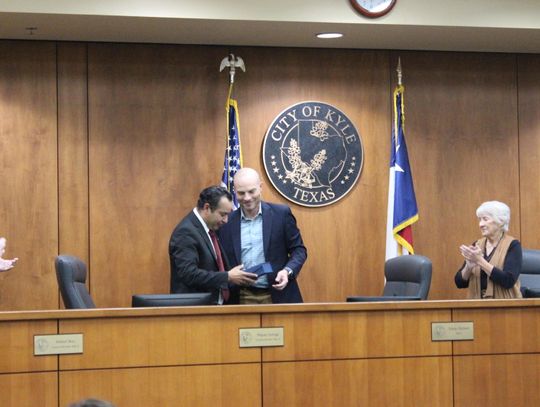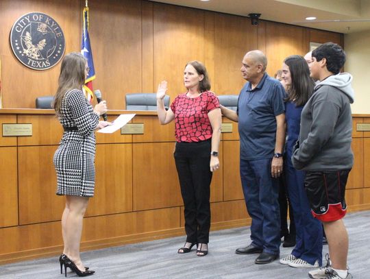 Kyle City Council acknowledged two newly-elected council members at its Nov. 18 swearing in ceremony. Claudia Zapata, pictured above, was sworn in by Hays County Judge Ruben Becerra. She replaced previous District 3 representative Miguel Zuniga. “[My mom] instilled in me, I think, the love of people. My mom is someone who just really, really loves people and I just hope that I can be as compassionate and kind and caring of a leader as she has been her entire life … I want to do big things and I want to do big things together and I look forward to working with my colleagues,” said Zapata.