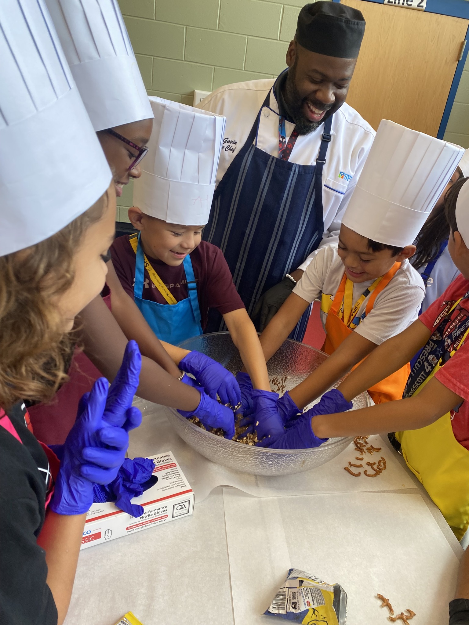 The program occurs approximately twice a month when a chef and a nutritionist go to one of the district’s campuses and a group of students — usually selected by the principal as a reward —work with the chef to create food, while learning about healthy eating.