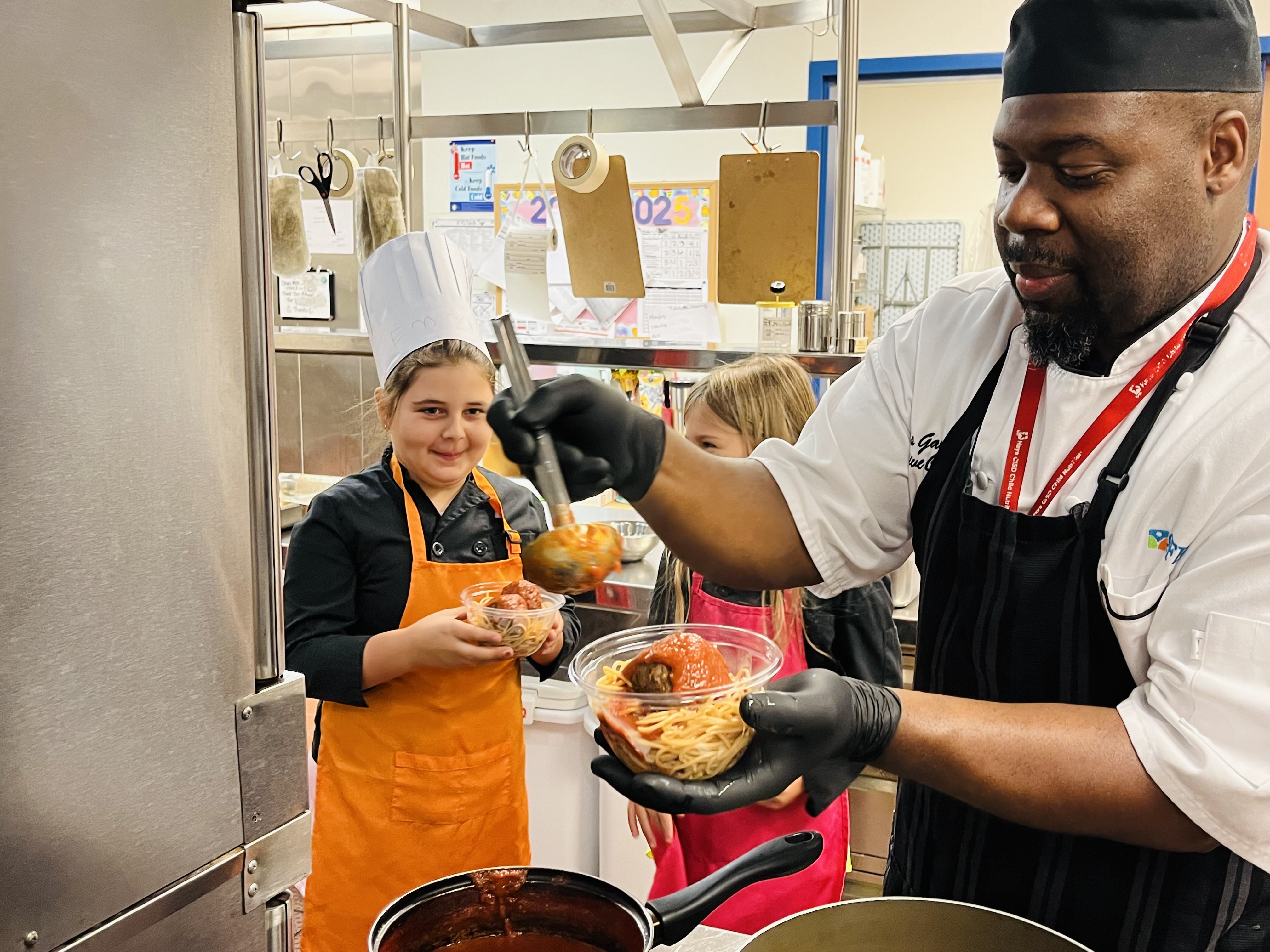 “My chef gets to the school ahead of time and he preps with a nutritionist and they lay everything out, so that way [the kids aren’t] waiting for anything,” explained Stone. “A lot of the items will come in cups and so, it’s kind of preassembled [and] ready for them to put together … The kids will come out, the chef will walk them through the instructions on the recipe, they’ll assemble it [and] if we need to bake it off or cook it, we’ll do it in the back. While it’s cooking or while they’re eating, my nutritionist will talk about some things.”