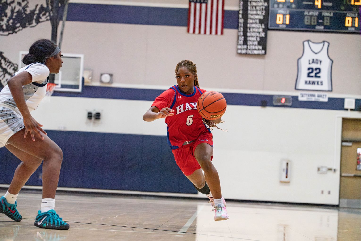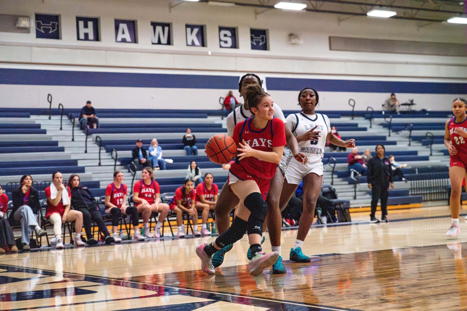 Hays High School Hawks girls basketball team member Faith Gray (No. 0) drives to the basket, as she is pursued by Hendrickson High School Hawks players during the teams’ nondistrict game Tuesday, Dec. 2. Hays topped Hendrickson 47-37 in the matchup.