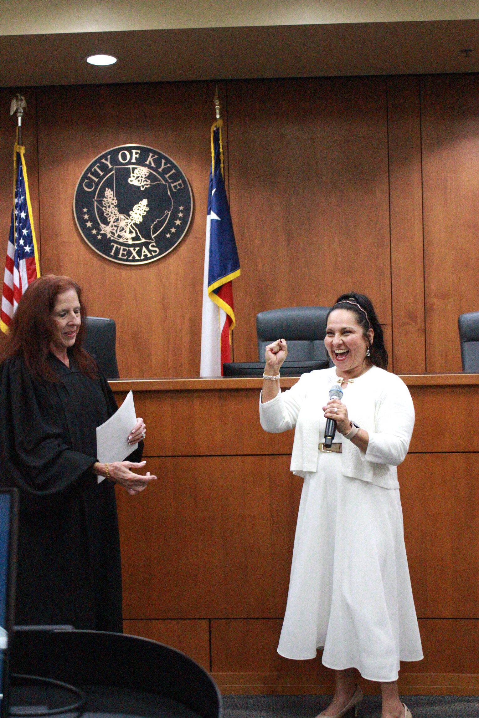 In front of a full crowd at city hall, the new mayor of Kyle, Yvonne Flores-Cale, and District 1 council member Courtney Goza were sworn in Tuesday, Dec. 23, by Judge Beth Smith.