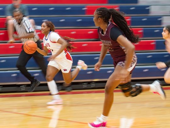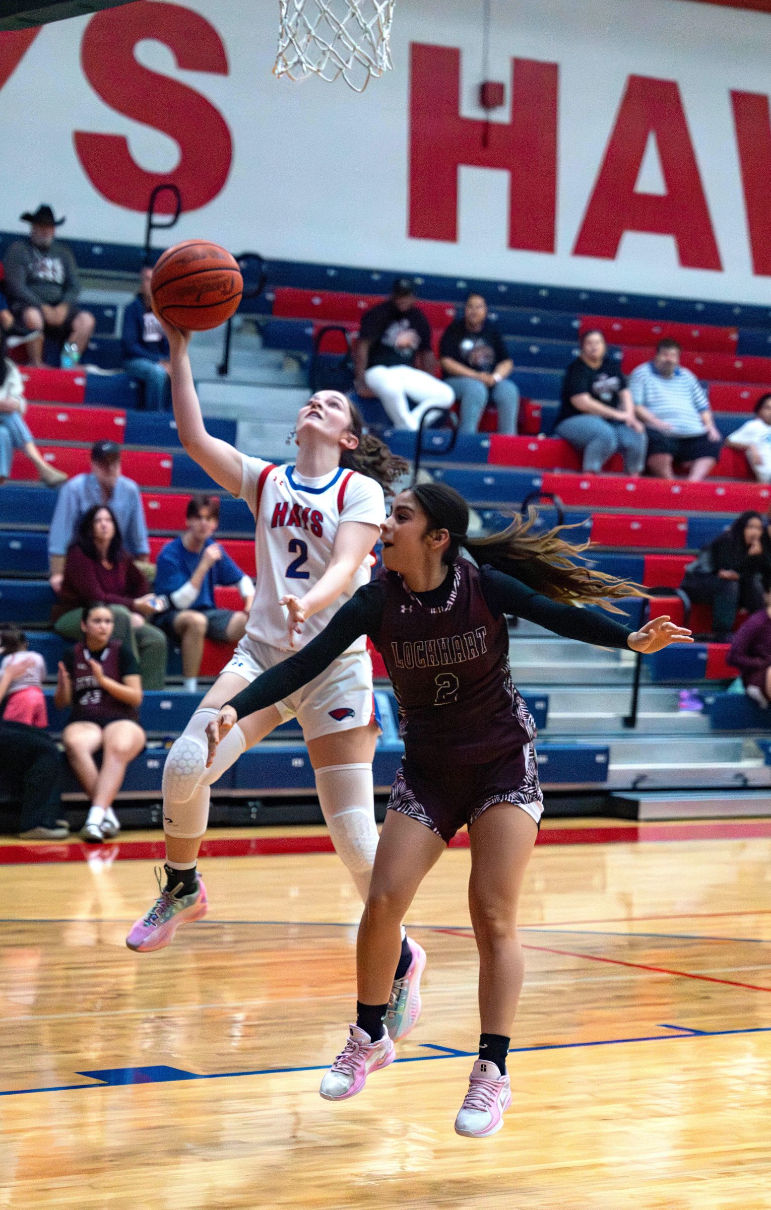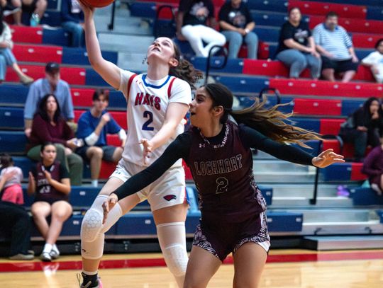 Hays High School Hawks senior point guard, Endia Stigall (No. 5), dashes across the court during the team’s district matchup against the Lockhart High School Lions Tuesday, Jan. 6. The Hawks took a dominating 60-20 win. The team went on to lose 66-37 to Glenn High School on the road Friday, Jan. 9, bringing its district record to 3-2.