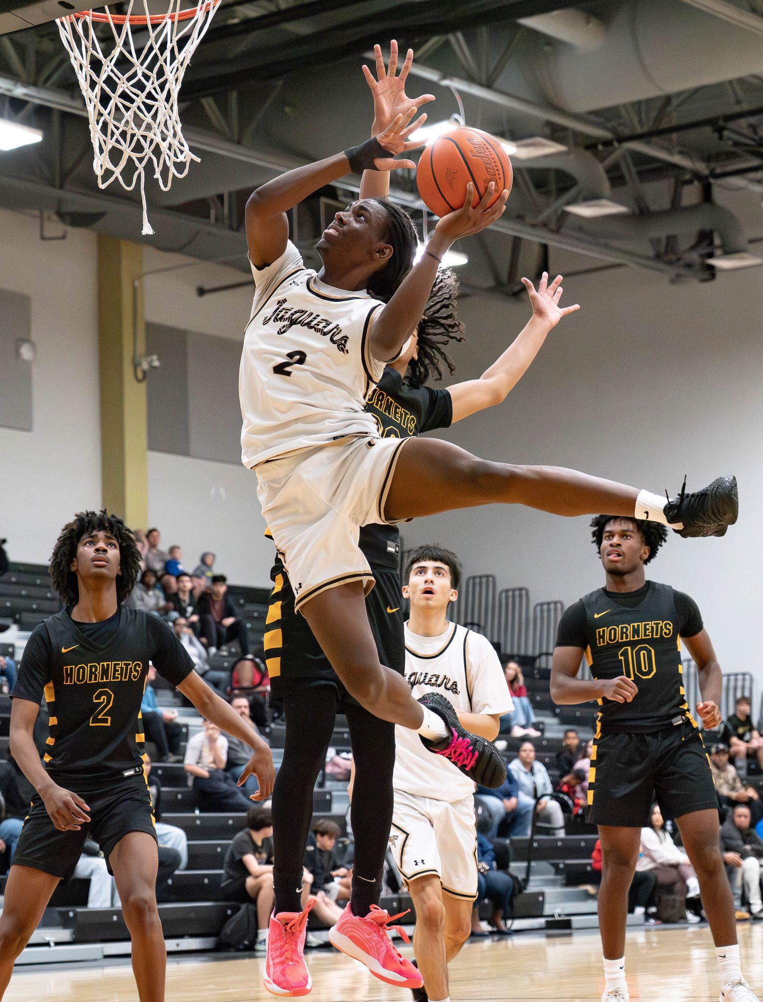 Johnson High School Jaguars boys basketball team (13-14 overall, 1-3 district) member Cole Price (No. 2) leaps into the air for a layup attempt during a home game against the East Central High School Hornets Friday, Jan. 16. The Jags fought hard, but ultimately lost 75-73.