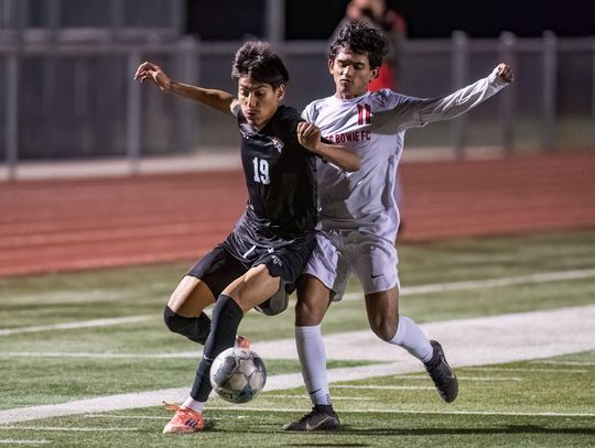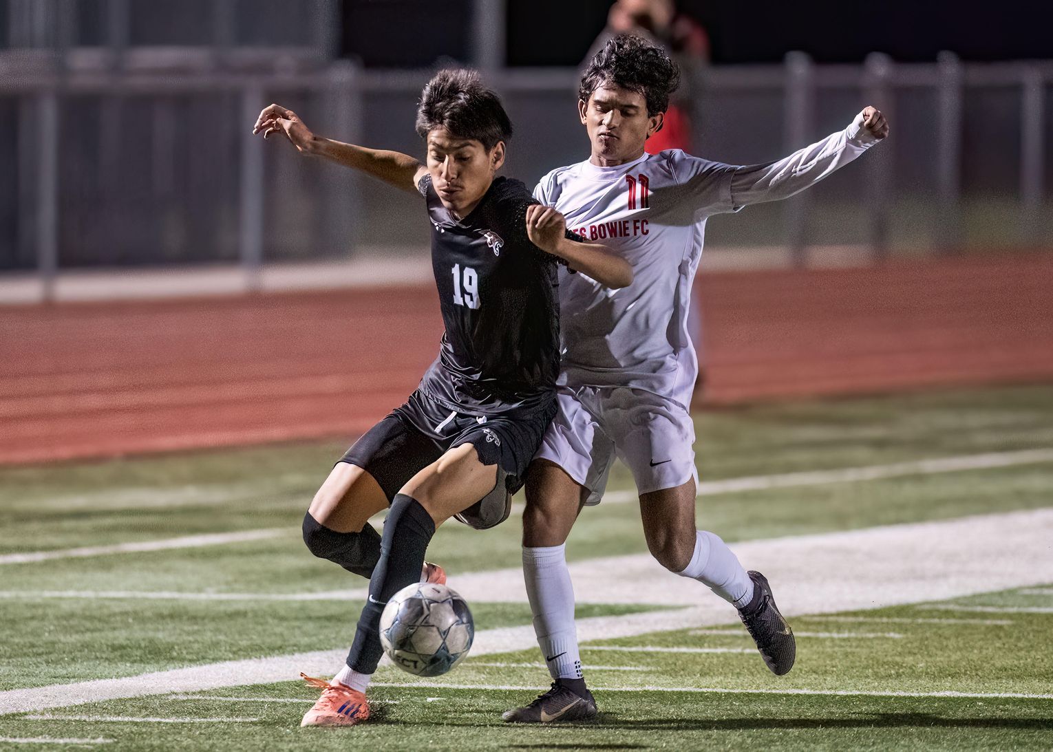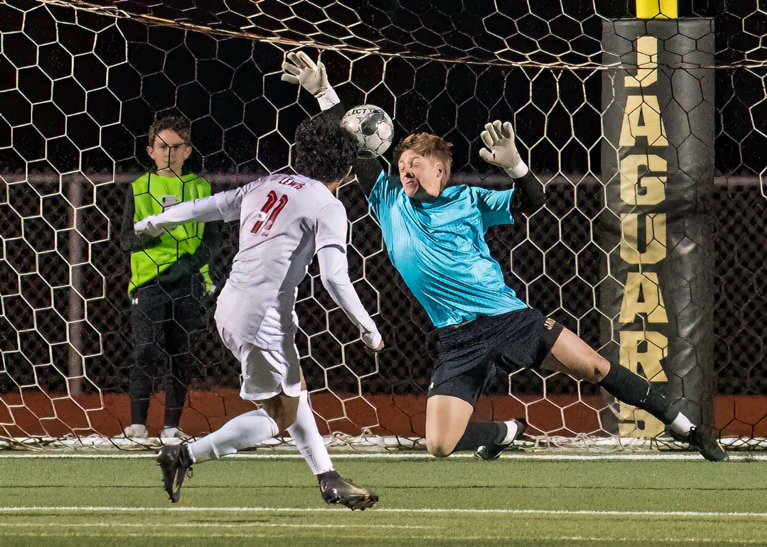 Johnson High School Jaguar boys soccer team goalie Grayson Arnett makes a save during the first half of the Jan. 13 contest against the Bowie High School Bulldogs. The Jaguars played tough during the first half and the halftime score was 0-0. During the second half, the Bulldogs scored two goals and the Jaguars only scored one, leaving the final score Bulldogs 2, Jaguars 1.