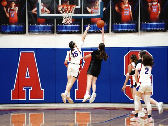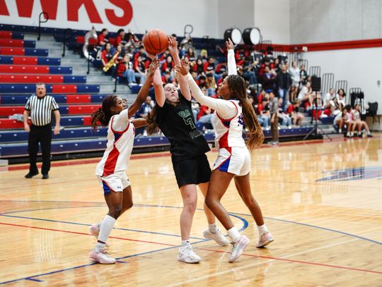 The Hawks trap a Timberwolves player, as she tries to make a pass. Hays went on to beat Leander High School 47-37 Friday, Jan. 23, bringing the team’s record to 18-11 overall, 5-4 district. Currently, the Hawks are fourth in the district. Hays will host Rouse High School (19-11 overall, 4-5 district) at press time Tuesday, Jan. 27.