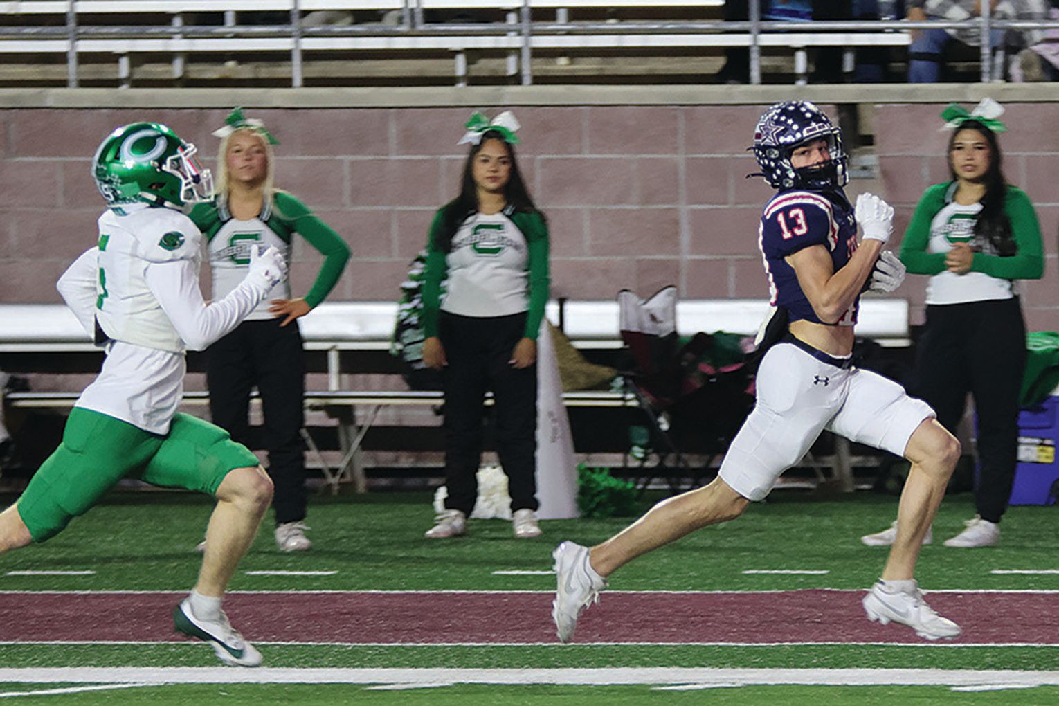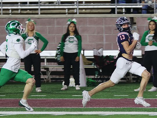 Before a minute had run off the clock, Wimberley quarterback Cody Stoever connected with Bryson Anderson for a 77-yard touchdown. The Texans led 35-21 at the half and held Cuero to just seven points in the second half, when the Gobblers returned a kickoff for a touchdown late in the fourth quarter.