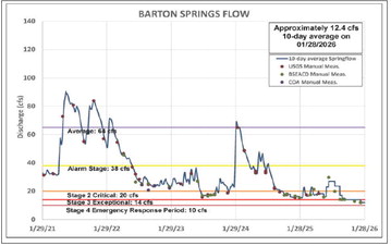 As of Jan. 28, the 10-day average at Barton Springs is at 12.4 cubic feet per second and Lovelady is at 454.3 feet above average sea level, both of which are very close to the cutoff of moving into Stage 4.