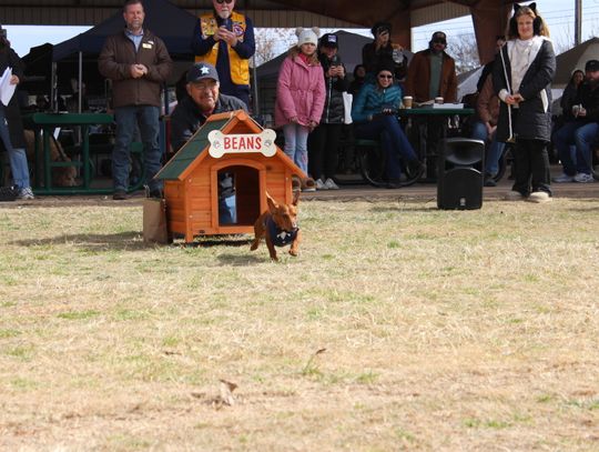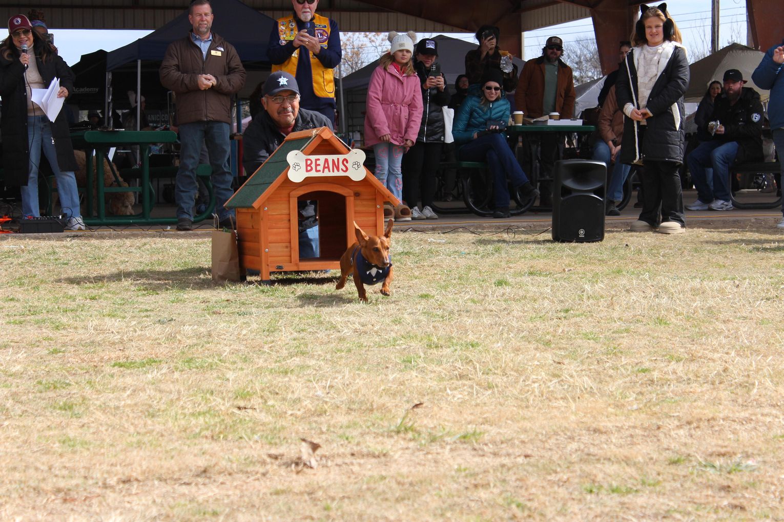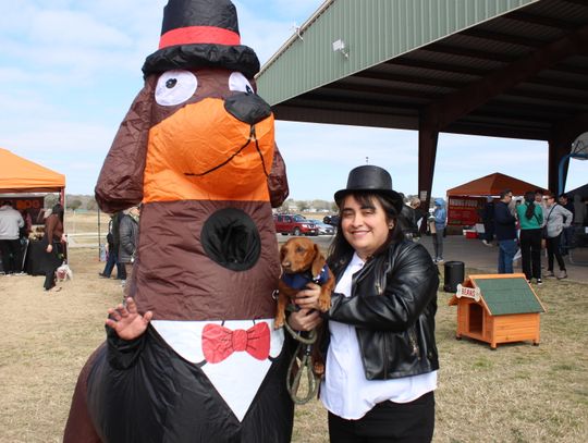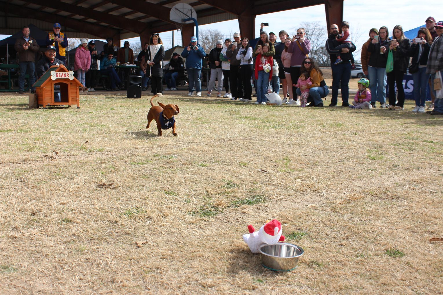 The Greater Buda Chamber of Commerce and the city of Buda hosted their second annual Ground Dog Day event Sunday, Feb. 1. Beans, pictured, zooms toward the snowman and sun stuffed animals — how he chose whether it would be six more weeks of winter or the beginning of spring.