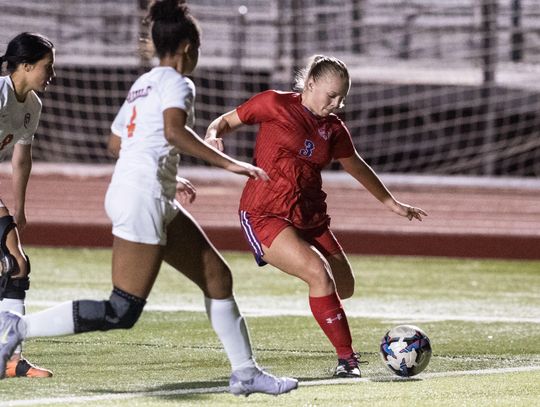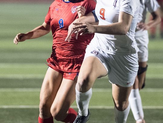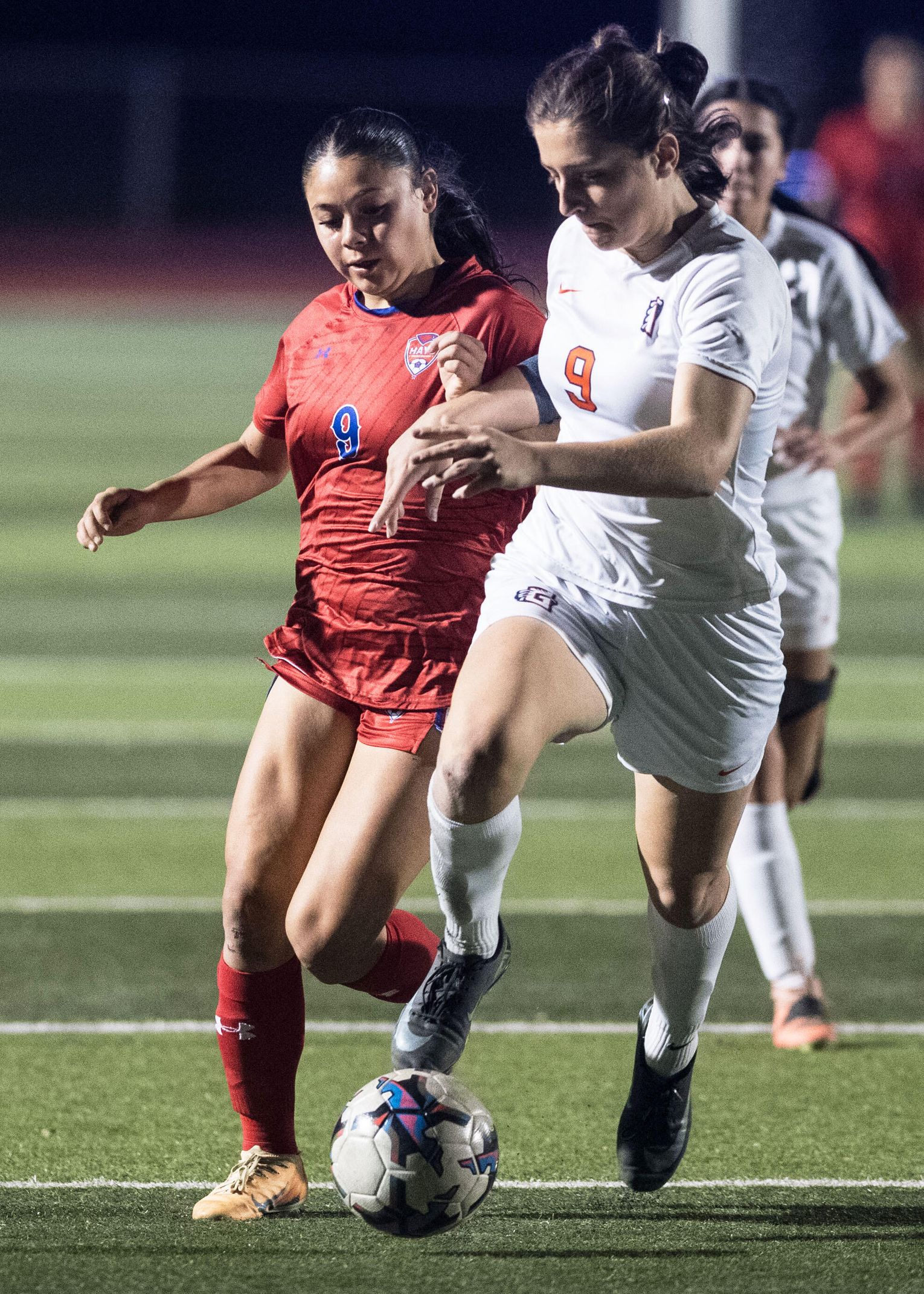 Hays High School Hawks girls soccer team member Bella Romero (No. 9) tries to gain control of the ball against a tough Glenn High School Grizzlies defender. The Hawks shut out the Grizzlies with the final score of 2-0 in the district matchup Friday, Feb. 6.