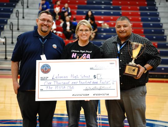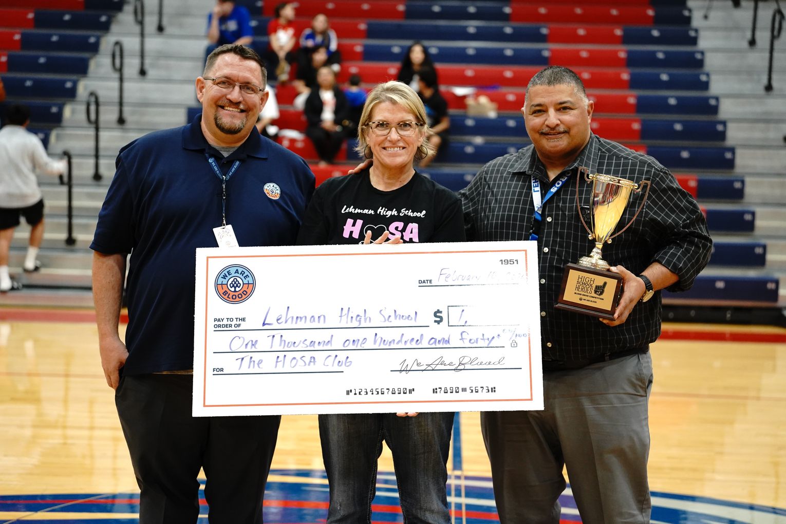 Recently, Hays and Lehman high school students competed in the We Are Blood High School Heroes blood drive competition. Hays registered 66 donors and received 49 units of blood. Lehman won the competition by registering 111 donors and bringing in 76 units of blood. During the Feb. 10 game, Lehman principal James Cruz accepts the trophy and a check for the school.