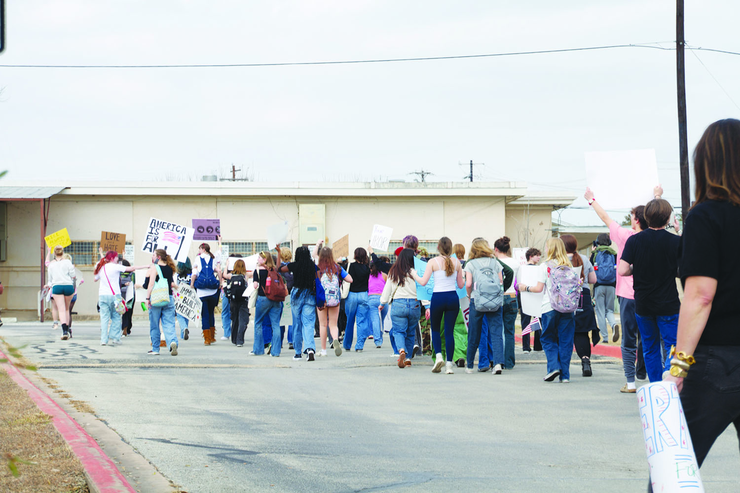 On Thursday, Feb. 12, Dripping Springs High School students participated in a planned walkout in protest of Immigrations and Customs Enforcement (ICE). At approximately 1:15 p.m., the students met in the parking lot of the school, marched down Sportsplex Drive, through the parking lot of the former Dripping Springs ISD Administration Building and into downtown, before making a loop and ending up back at on school grounds. According to a statement by DSISD on Feb. 5, while it was aware of the reports of a student-planned walkout, “Neither the district nor any DSISD campus administrator is organizing, facilitating or sponsoring these student-organized events.”