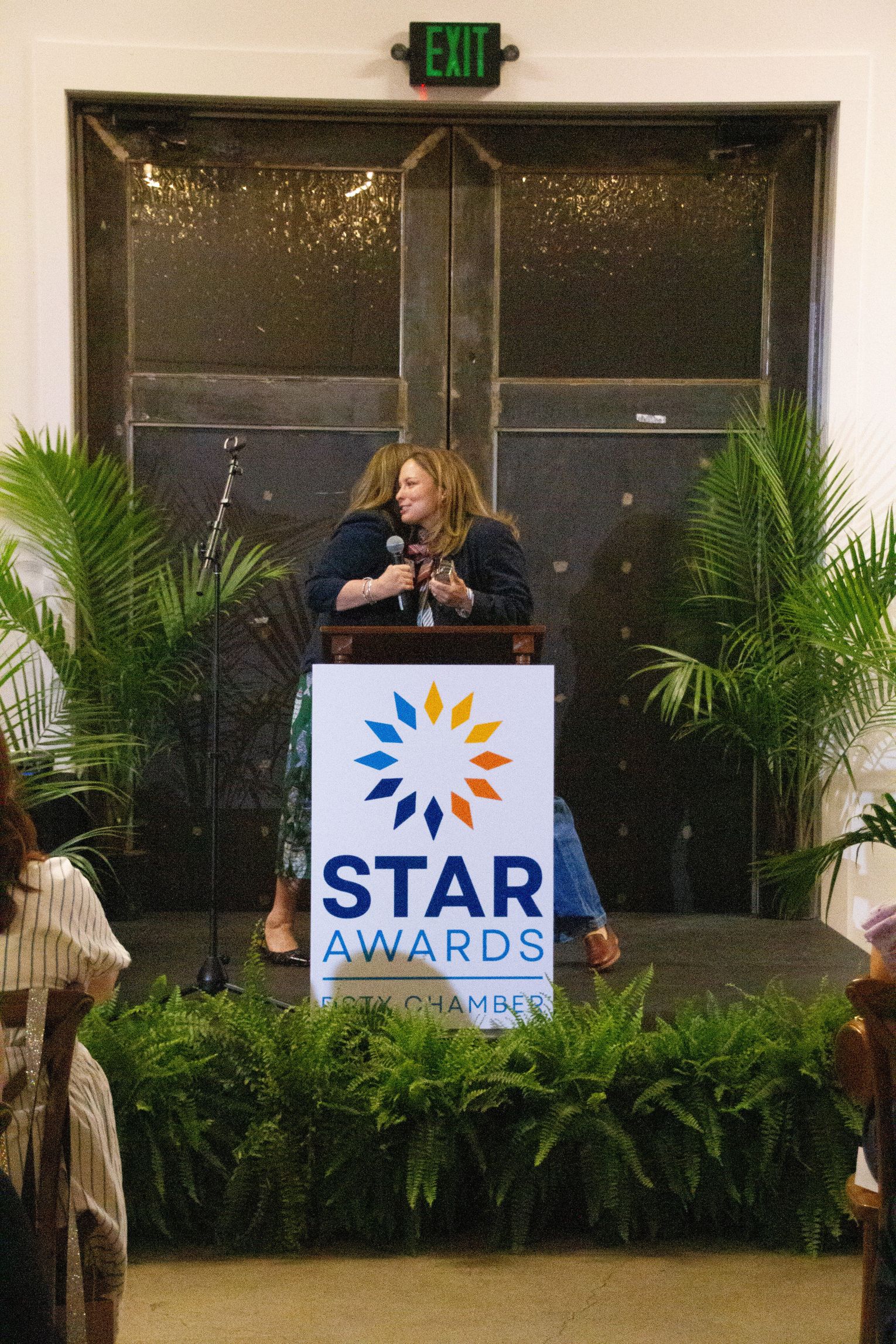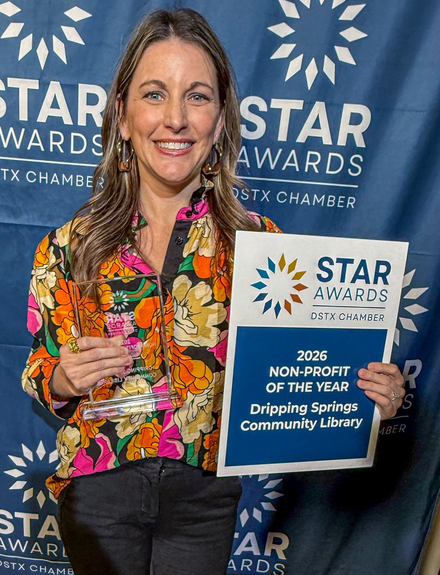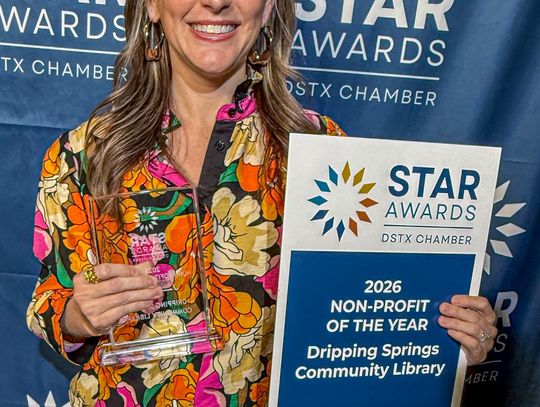 The Dripping Springs Community Library was voted Non-Profit of the Year. Executive director Mindy Laird accepted the award and thanked attendees. “Looking out right now, I see friends. I see library volunteers; I see staff members. I see other nonprofits that support us; I see business supporters and sponsors. Everywhere I look is someone that has supported us. So, thank you so much,” she said.