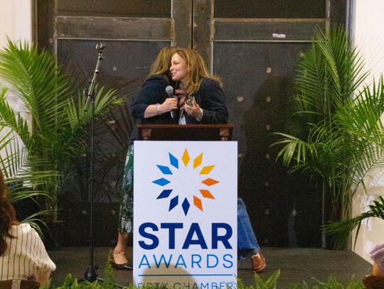 Prior to the awards, Chamber President Susan Kimball, left, was surprised to be recognized for her 10 years of service to the organization. “I wouldn't be standing up here today if it wasn't for Susan Kimball, as well as many people here wouldn't be so involved in the business community. And we are a very tight knit community. We are a special community and it is 100% because of this lady right here,” said chamber board chair Eustacio Lara.