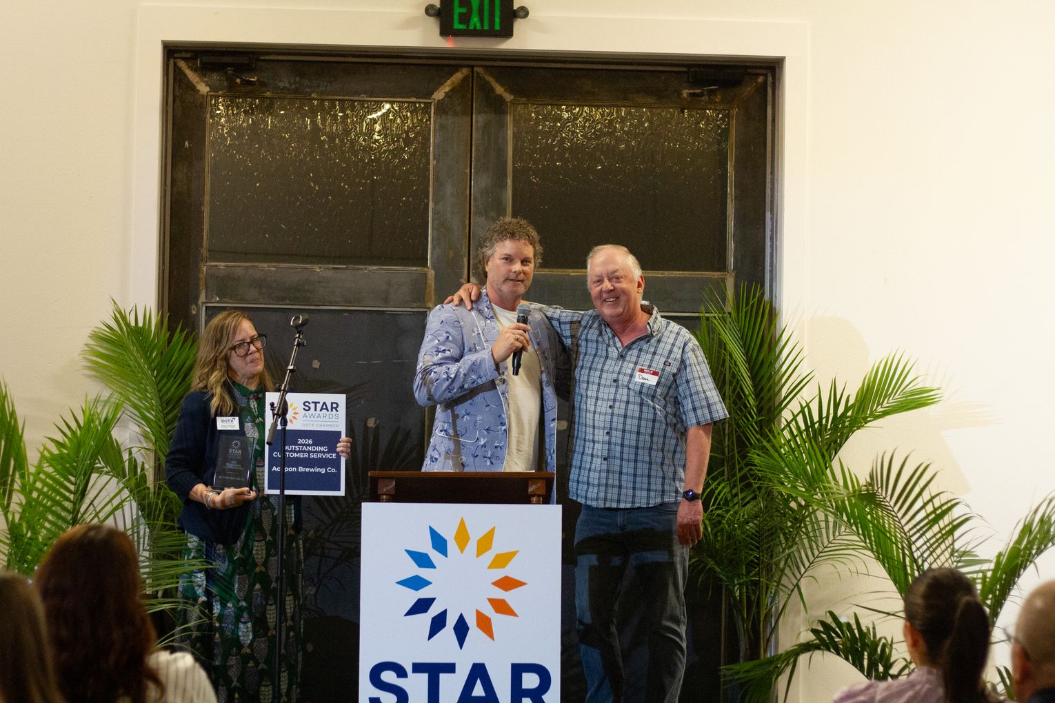 Outstanding Customer Service Award winner Acopon Brewing Co. founder Dave Niemeyer, right, poses for a photo with the 2025 winner, Dr. Chae Tracy of Curis Functional Health. “This is, no offense to the other awards, but this is the most important one. If you don't have it, you're going to suffer,” Niemeyer said.