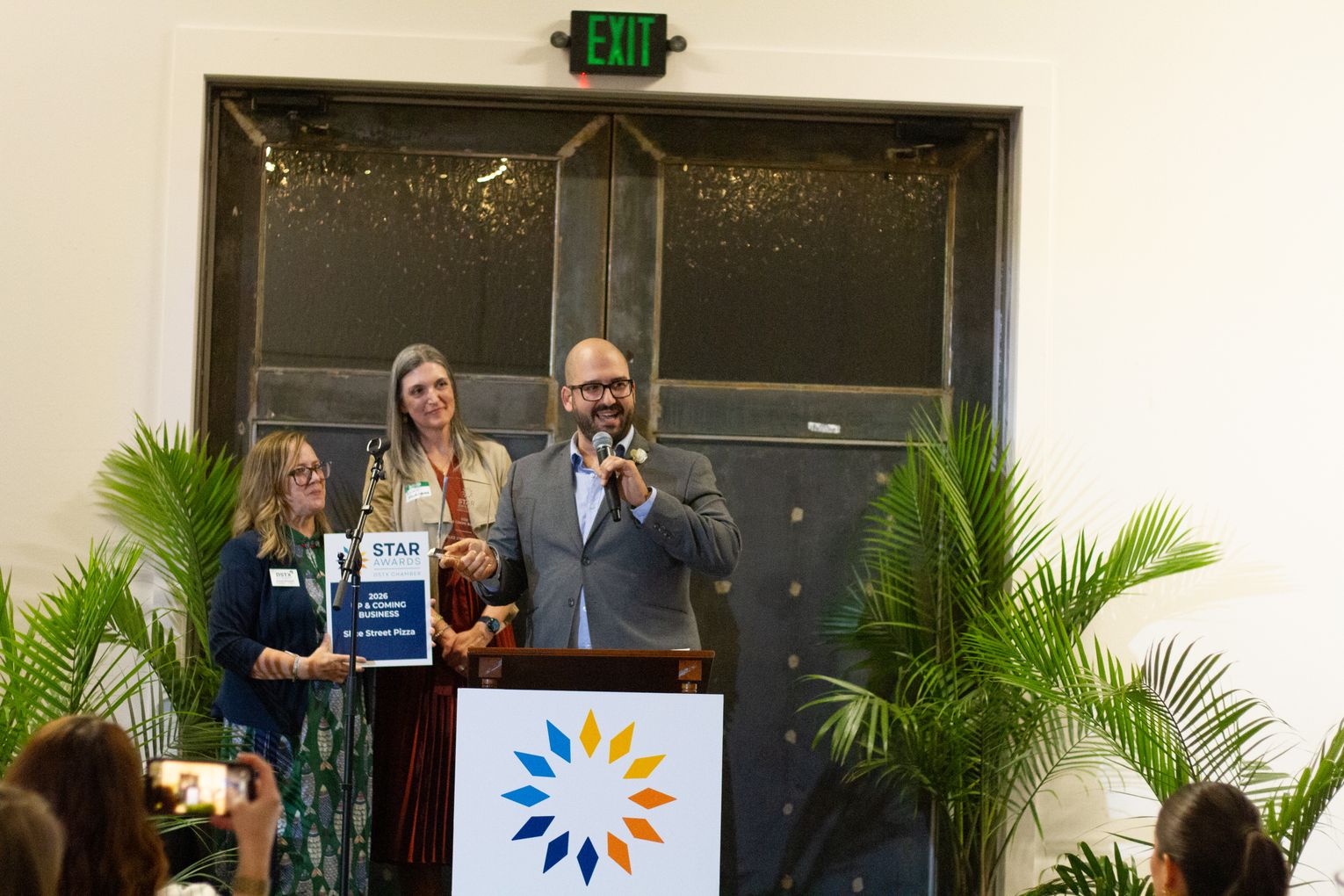 Businesses open for three years or less vied for the Up & Coming Business award, including Dynamo Dusty’s Tree Service, Fire & Flow Pilates, The Girly Birds, Natkhat Flavors and Slice Street Pizza. “So many of you, and many of you who are in this room tonight, came week after week, day after day, despite the fact that we made your pizza wrong, despite the fact that we were 30 minutes or 40 minutes or three hours late to make your pizza,” said Slice Street Pizza owner Darius Aram, as he accepted the award. “I think that this would not be possible in any other community and this community is really something special.”