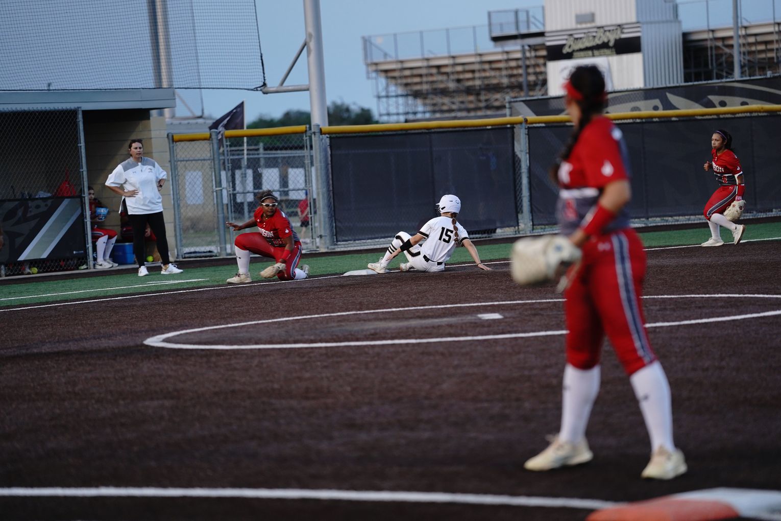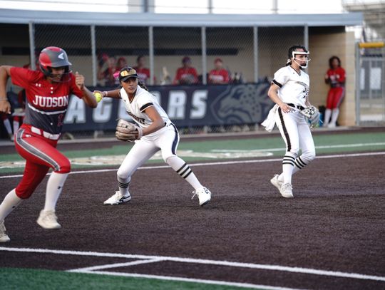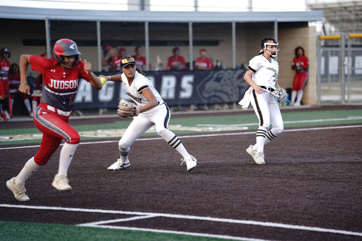 Johnson High School Jaguars softball team member Mia Ruiz prepares to throw the ball toward first base to get an out against the Judson High School Rockets during their matchup Tuesday, March 31, at Johnson High School. The Jaguars won 11-0 in the district game.