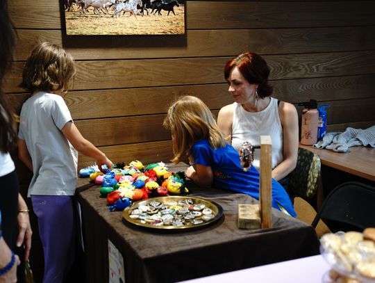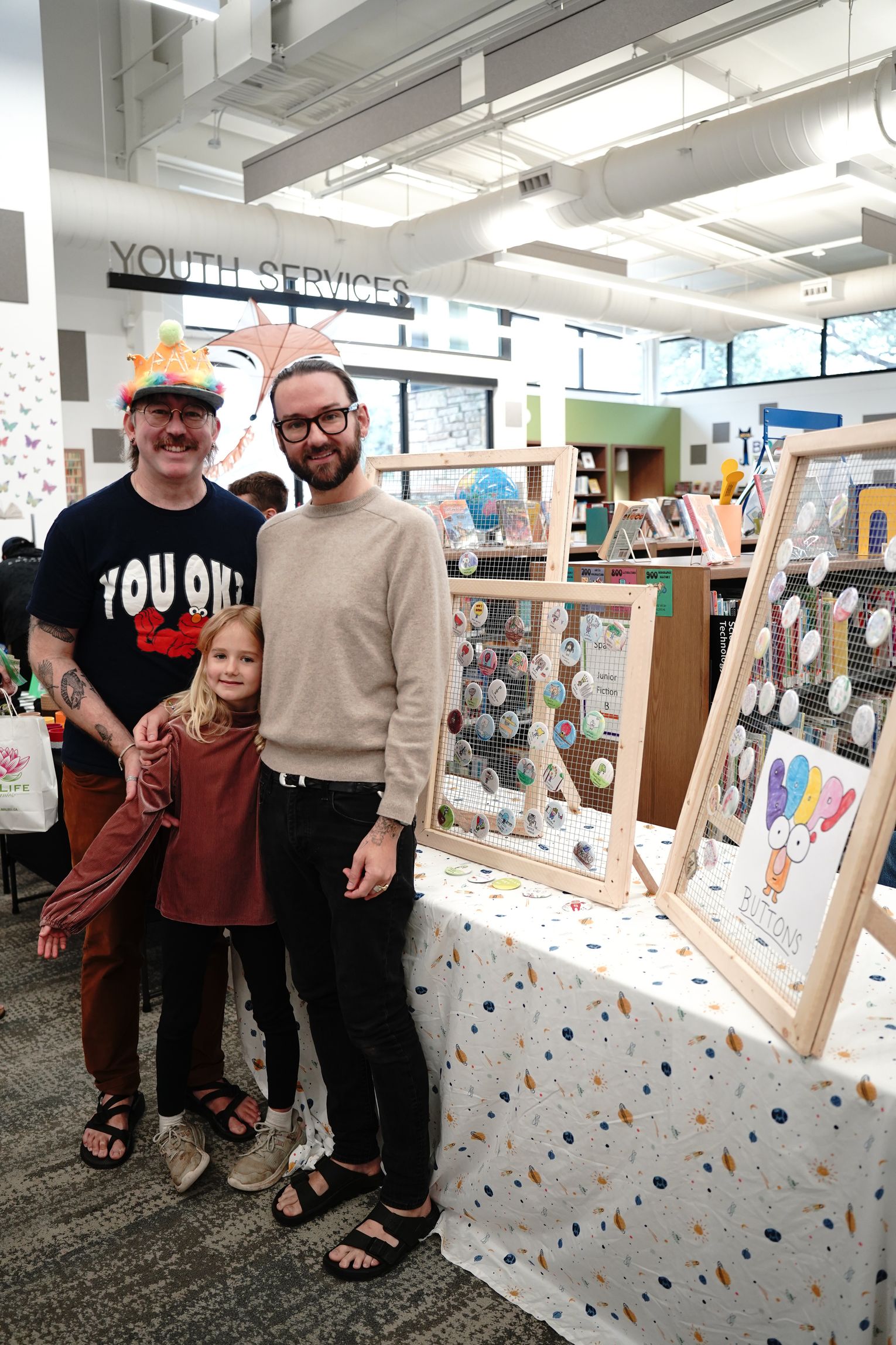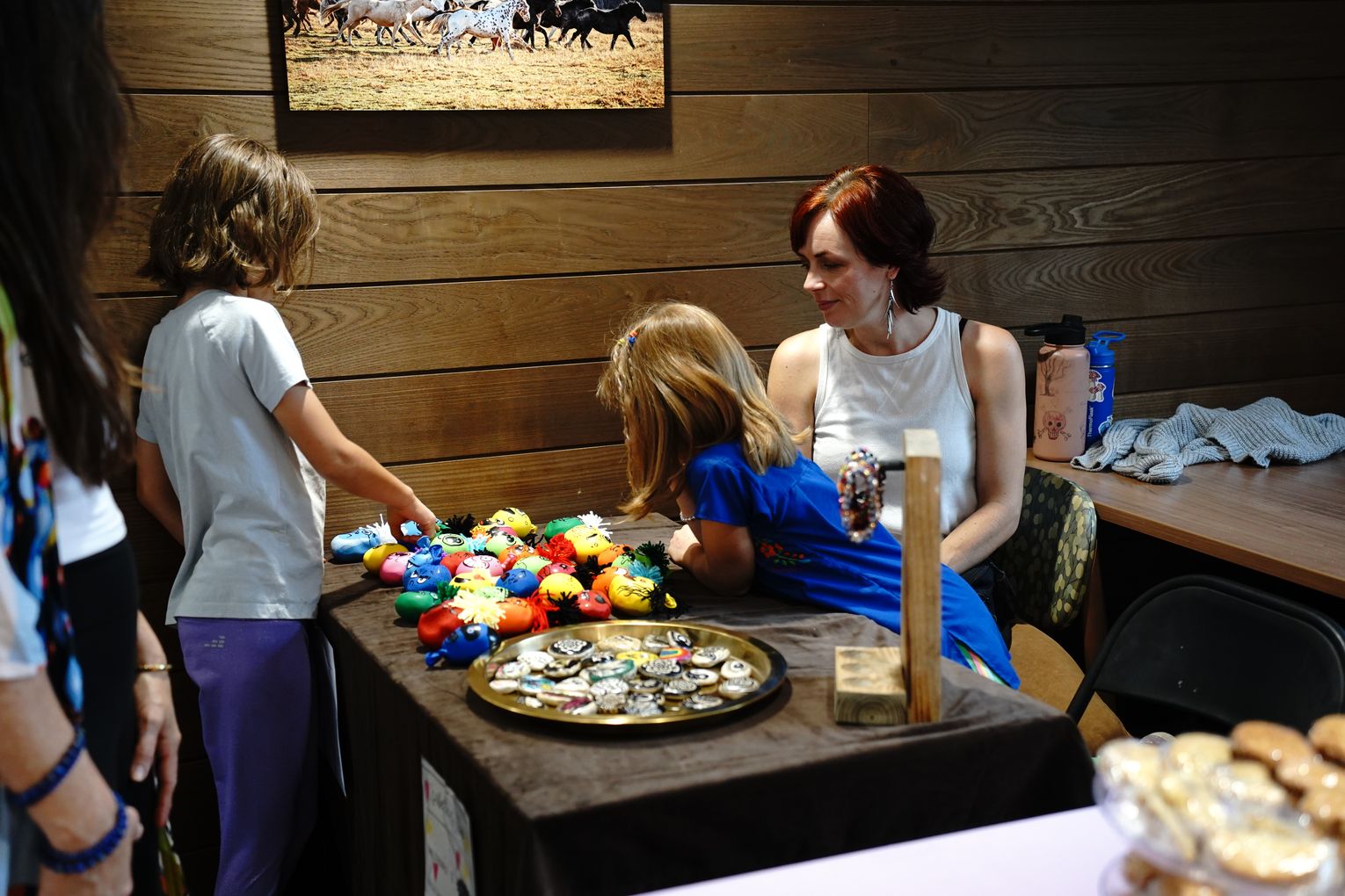 An attendee peruses the wares at Isabelle’s Shop, run by 8-year-old Isabelle, middle, and her mom, Nicole, right.
